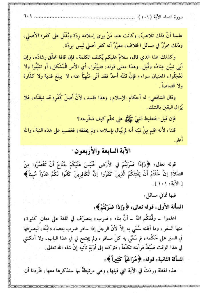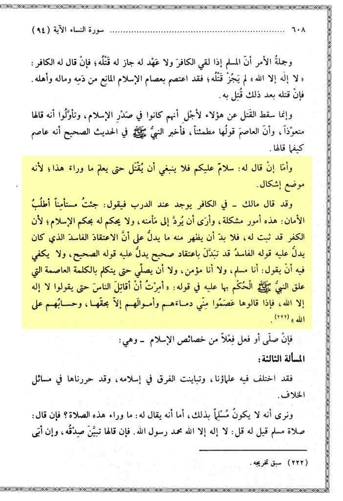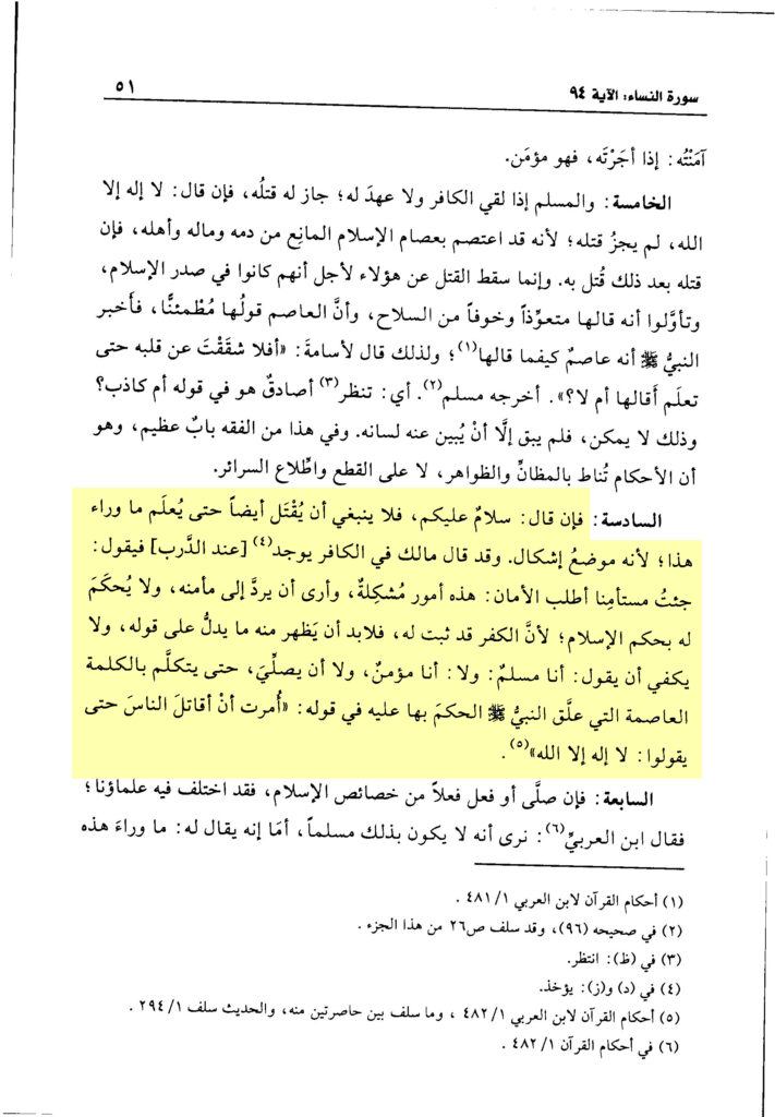 Und ebenso ist es (für) denjenigen, der sagte: ‚Salām ʿalaykum‘, er wird verpflichtet mit dem Wort (der Schahāda), so wenn er es sagt, bewahrheitet sich sein richtiges Handeln und wenn er sich weigert, wird sein Widerstand ersichtlich und (…)¹. Und dies ist die Bedeutung Seiner Aussage: »So verschafft euch Klarheit« [4:94] Das bedeutet (über) die unklare Angelegenheit oder prüft nach und seid nicht in Eile. Die beiden Bedeutungen sind gleich.