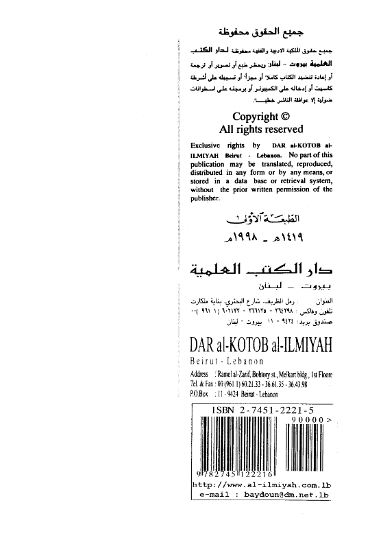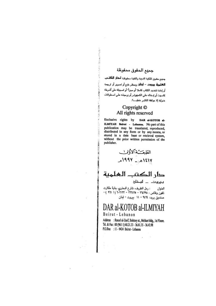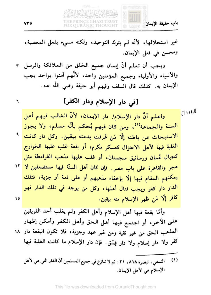 „Wisse, dass Dār al-Islām und Dār al-Īmān (sie selbst) sind, weil der Herrschende in ihnen Ahl as-Sunna wa al-Jamāʿa ist. Wer in ihnen ist, wird beurteilt als Muslim und das Erforschen nach seinem Inneren ist nicht erlaubt, außer wessen Erneuerung bekannt ist, mit Gewissheit (Yaqīn). Jedes Gebiet (Dār) in dem der Herrschende die Leute des Iʿtizāl (die Muʿtazila) sind, wie (die Stadt) ʿAskar Mukram, oder ein Fleck, den die Khawārij bemächtigt haben, wie die Berge von ʿUmān und die Dörfer von Sijistān, oder (in) dem die Lehre der Qarāmiṭen vorherrscht, wie (das Königreich) Hijr und Kairo am Tor von Ägypten. So wenn die Ahl as-Sunna in ihnen unterdrückt ist, für sie der Aufenthalt in ihnen nicht möglich ist, außer durch das Verbergen ihres Glaubens, durch Ḏhimma oder Jizya, so ist jenes Gebiet Dār al-Kufr und der Kampf (gegen) seine Anhänger ist Pflicht. Und jeder, der sich in jenem Gebiet (Dār) befindet, so ist er Kāfir, außer wessen Islam offenkundig wird, mit Gewissheit (Yaqīn)“