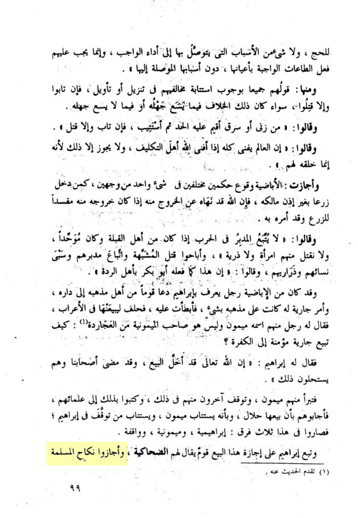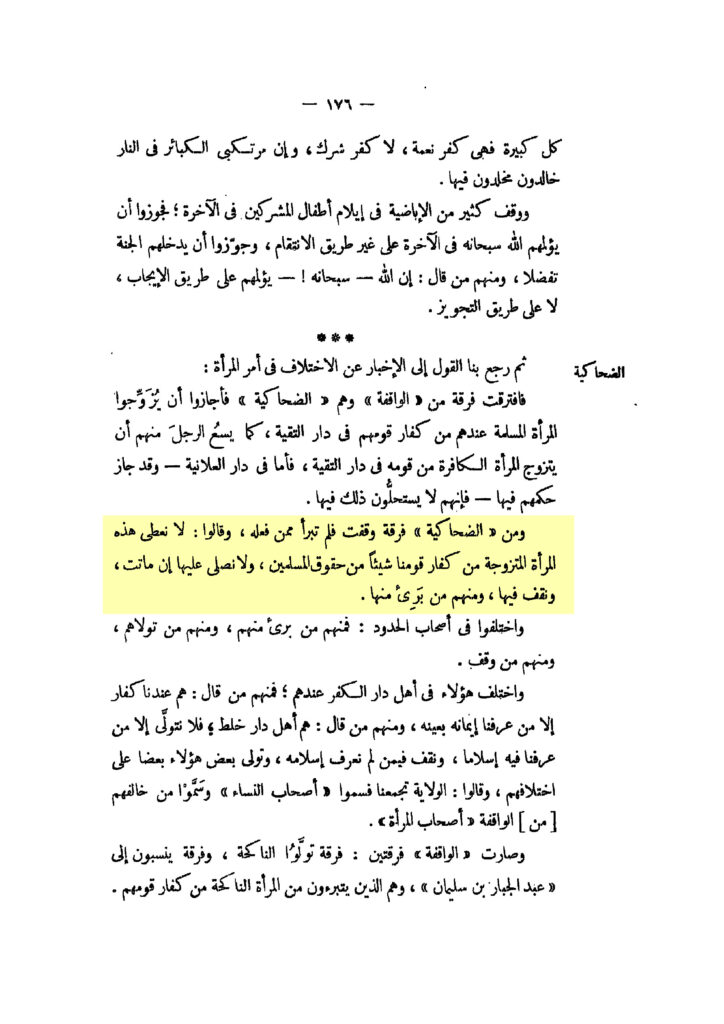 „Und von den Ḍuḥākīya ist eine Gruppe, sie zögern und haben sich nicht losgesagt von dem, der es tat und sie sagten: ‚Wir geben dieser, mit Kuffār unseres Volkes, verheirateten Frau nichts von den Rechten der Muslime, wir beten nicht über sie, wenn sie stirbt und wir zögern bezüglich ihr‘. Und (einige) von ihnen sagen sich von ihr los.“