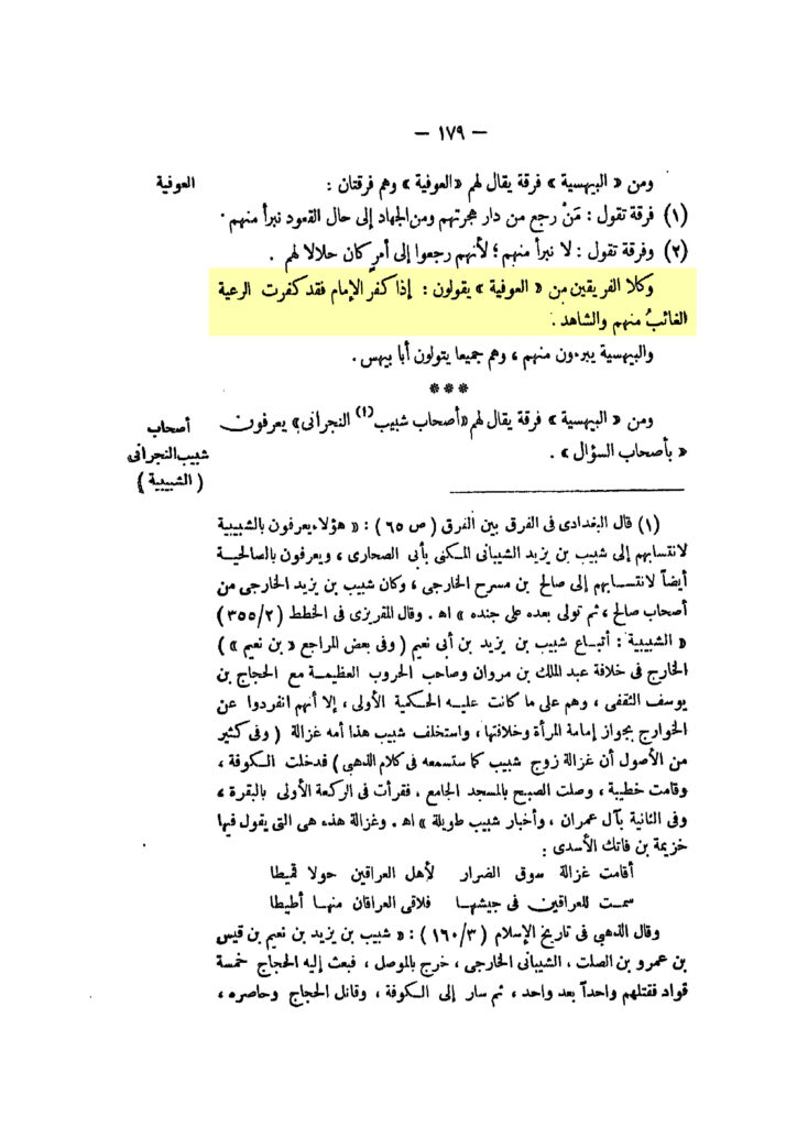 „Und beide Gruppen von den ʿAwfiyya sagen: Wenn der Imām zum Kāfir wird, so wurde der Untertan zum Kāfir, der Abwesende von ihnen, und der Anwesende“