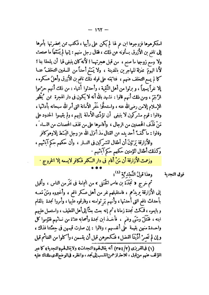 „Die Azāriqa behaupteten, dass wer wohnhaft ist in Dār al-Kufr, ein Kāfir ist, er kann nichts tun, außer die Ausreise“