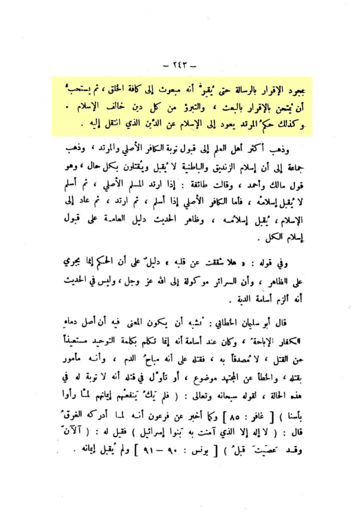 So wer von ihnen bestätigt, dass Muḥammad der Gesandte Allāhs ist, ist kein Muslim, bis sich er zusammen mit jenem von seinem Dīn lossagt oder er bestätigt, dass er in den Islām eingetreten ist. Auch wenn der Jude oder Christ sagt: ‚Ich bin Muslim‘ oder ‚Ich bin Muslim geworden‘, wird er nicht mit dem Islām beurteilt (er gilt nicht als Muslim), weil sie jenes nicht behaupten. Denn wahrlich, der Muslim ist der Wahrheit sich ergebende, der zu ihr fügsame. Und sie behaupten, dass die Wahrheit das sei, worauf sie sind. So ist die Äußerung dieser Aussprache hinsichtlich ihnen kein Beweis des Islāms, bis sie sich von ihrem Dīn zusammen mit jenem lossagen.“