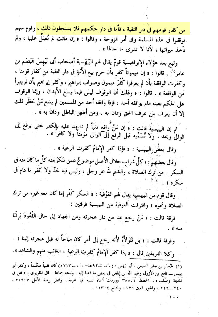 „Und sie erlaubten die Heirat der Muslima mit Kuffār ihres Volkes in Dār at-Taqīya. So was im Dār ihres Urteils anbelangt, so halten sie jenes nicht für erlaubt“