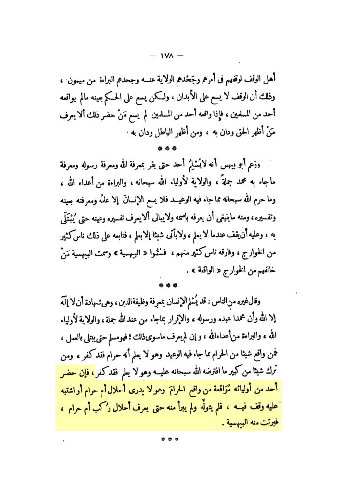 „So wenn einer von seinen Awliyāʾ anwesend ist, an Orten von (einem) Ḥarām-Ereignis, und er weiß nicht, ob es Ḥalāl oder Ḥarām ist, oder er ist im Zweifel über es, er zögert darin, er übernimmt es nicht und er spricht sich nicht frei von ihm, bis er weiß, ob das Begangene, Ḥalāl oder Ḥarām ist, dann sprechen sich die Bayhasīya von ihm frei“