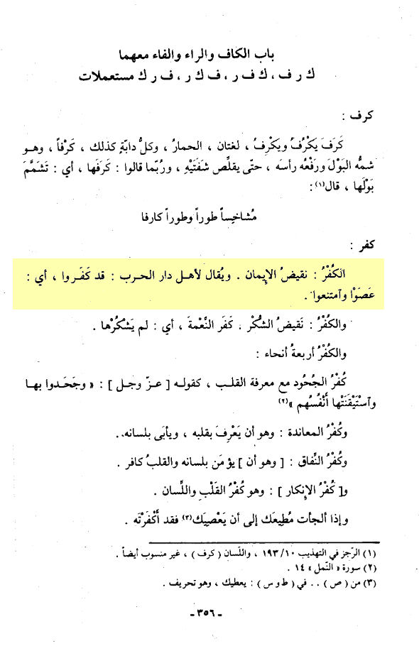 „Kufr: Das Gegenteil von Īmān. Es wird gesagt, für die Bewohner von Dār al-Ḥarb: Sie sind Kāfir. Das bedeutet: Sie haben sich widersetzt und sich geweigert“