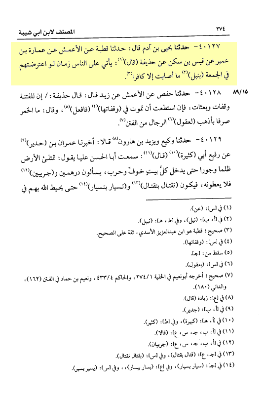 von Ḥudhayfah, er sagte: „Über die Menschen wird eine Zeit kommen, wenn du dich ihnen entgegenstellen würdest beim Jumuʿa (mit Pfeilen), würdest du niemanden treffen außer einen Kāfir“