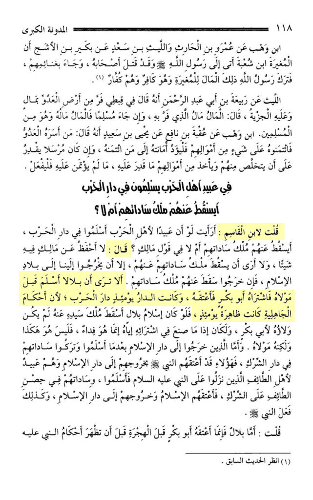 „Ich sagte zu Ibn al-Qāsim: (…) Er (Ibn al-Qāsim) sagte: (…) Siehst du nicht, dass Bilāl vor seinem Herren Muslim wurde, so kaufte ihn Abū Bakr und er befreite ihn. Und das Dār war damals Dār al-Ḥarb, weil die Urteile der Jāhilīya damals vorherrschend waren.“