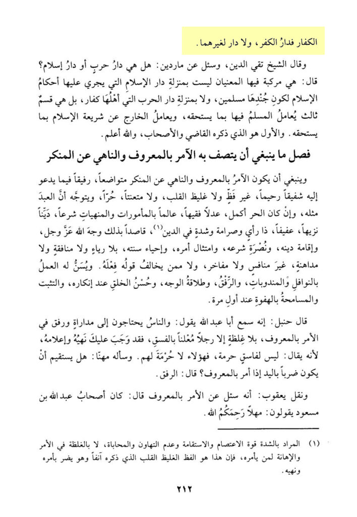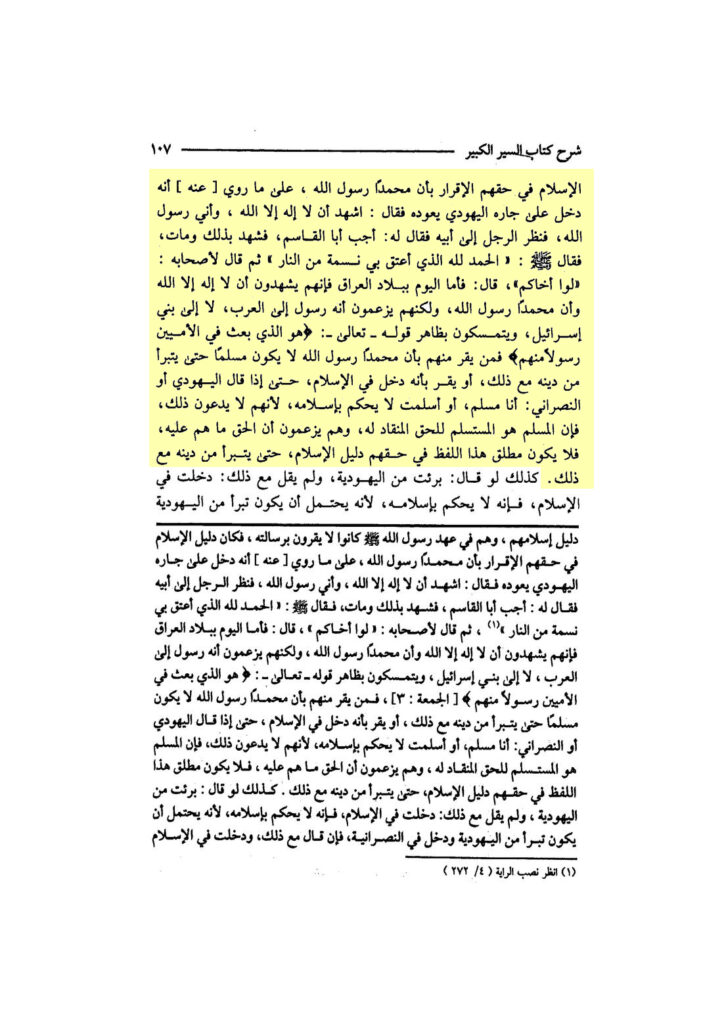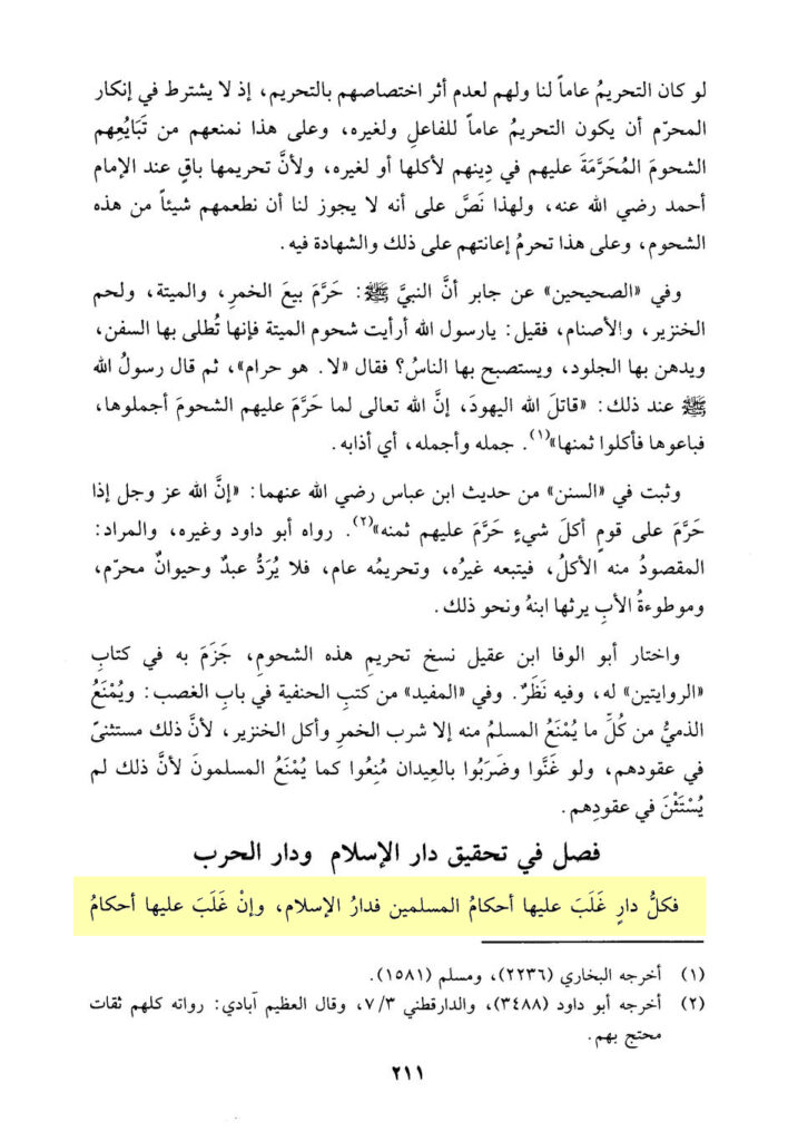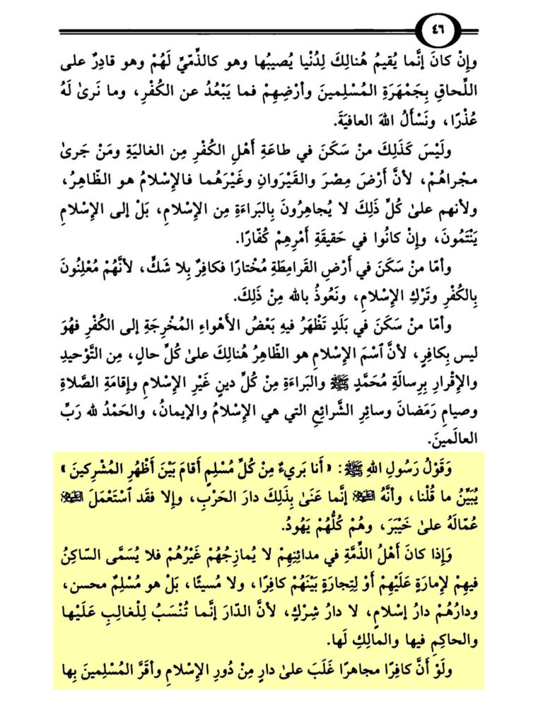 „Die Aussage des Gesandten Allāhs, Allahs Segen und Frieden auf ihm: ‚Ich bin unschuldig von jedem Muslim, (der) zwischen den Rücken der Mushrikūn wohnt (metaphorisch: unter ihnen)‘, erklärt, was wir sagten und dass er, der Friede sei auf ihm, mit jenem nur Dār al-Ḥarb meinte und so hat er, der Friede sei auf ihm, doch seine Arbeiter in Khaybar benutzt und sie waren alle Juden. Und wenn die Ahl ad-Ḏhimma in ihren Städten sind, (und) sie vermischen sich nicht (mit) anderen, so wird der Wohnhafte in ihnen, um Amīr über sie zu sein oder zum Handel unter ihnen, nicht als Kāfir oder Übeltäter betitelt, sondern vielmehr ist er ein guter Muslim und ihr Gebiet ist Dār al-Islām, nicht Dār ash-Shirk, weil das Gebiet nur zugeschrieben wird zu dem Dominierenden (wer die Macht darüber hat) über es, dem Herrschenden in ihm und dem Besitzer von ihm.