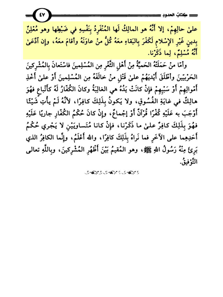 Und wenn ein kämpfender Kāfir ein Gebiet von den Gebieten des Islāms überwältigt und er erkennt die Muslime an, in ihrem Zustand (er lässt sie), außer, dass er der Besitzer von ihm, der alleinige in seiner Kontrolle ist und er verkündet einen Dīn, außer dem Islām, so ist Kāfir durch das Bleiben mit ihm, jeder wer ihm hilft und sich mit ihm aufhielt, auch wenn er behauptet, dass er Muslim ist, wegen was wir erwähnten“