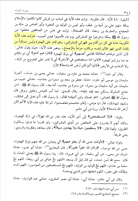 „So wurde dieser edle Vers herabgesandt, allgemein, über jeden, der zwischen den beiden Rücken der Mushrikūn (unter ihnen) wohnt. Und er ist in der Lage zur Hijra und er ist nicht fähig zur Errichtung des Dīn, so ist er ungerecht zu sich selbst, (und) begeht Ḥarām per Konsens (ijmāʿ).“