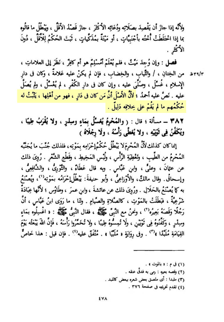 „Denn die Regel (Aṣl) ist, dass wer in einem Dār (Gebiet) war, so ist er von seinen Leuten. Für ihn ist ihr Urteil bestätigt, sofern nicht über seinen Widerspruch ein Beweis erbracht ist“