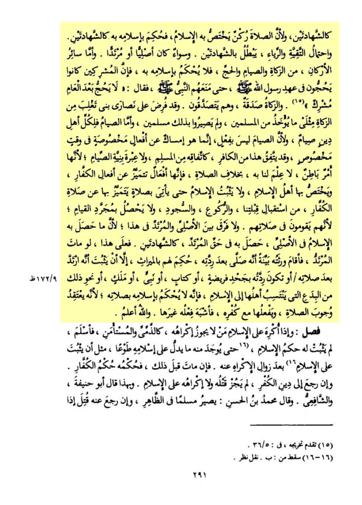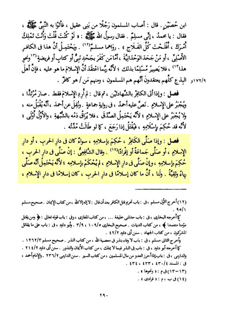 „Wenn der Kāfir betet, wird er mit seinem Islām beurteilt, egal, ob er in Dār al-Ḥarb oder in Dār al-Islām war (egal) ob er in Gemeinschaft oder alleine betet. Und ash-Shāfiʿi sagte: Wenn er in Dār al-Ḥarb betete, wird er mit seinem Islām beurteilt, und wenn er in Dār al-Islām betete, wird er nicht mit seinem Islām beurteilt, denn es ist möglich, dass er aus Heuchelei und Taqīya betete. Und für uns (die Ḥanābila) ist, dass, was als Islām in Dār al-Ḥarb gilt, so ist es Islām in Dār al-Islām, wie die beiden Bezeugnissen (der Shahāda). Und weil das Gebet eine Säule ist, die speziell für den Islām ist, so wird mit ihm sein Islām beurteilt, wie bei den beiden Bezeugnissen (der Shahāda). Die Möglichkeit der Taqīya und Heuchlerei wird hinfällig, mit den beiden Bezeugnissen (der Shahāda). Egal, ob er ein Aṣli oder ein Murtadd war.