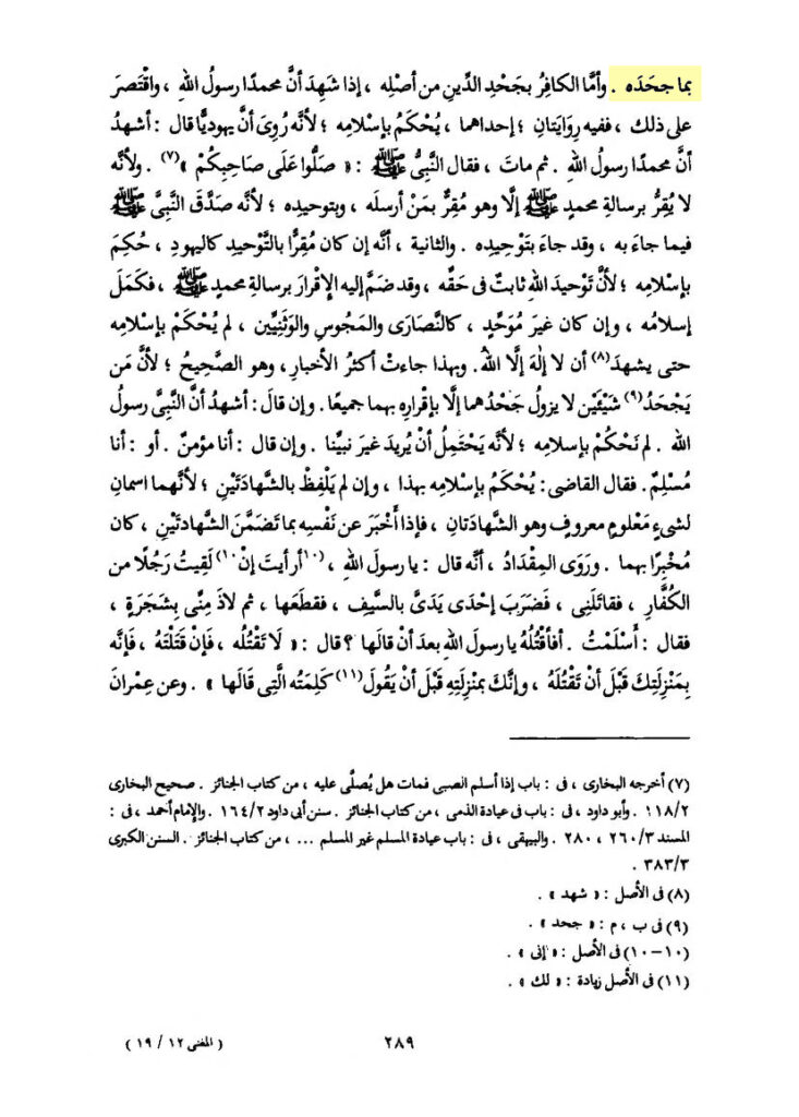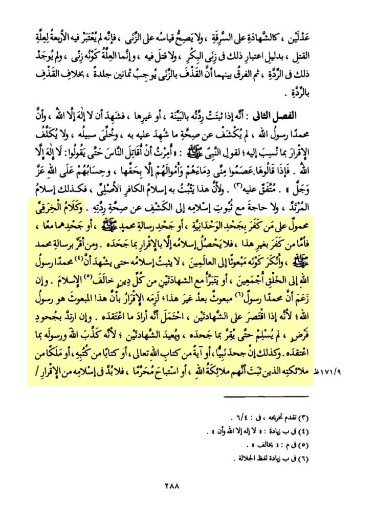 „Und die Worte von al-Khiraqī (Abū al-Qāsim al-Khiraqī al-Ḥanbalī) sind bezogen auf wer Kāfir wurde, durch Ablehnung der Einheit (Allāhs), oder Ablehnung der Botschaft Muḥammads, Allāhs Segen und Frieden auf ihn, oder Ablehnung von beidem.