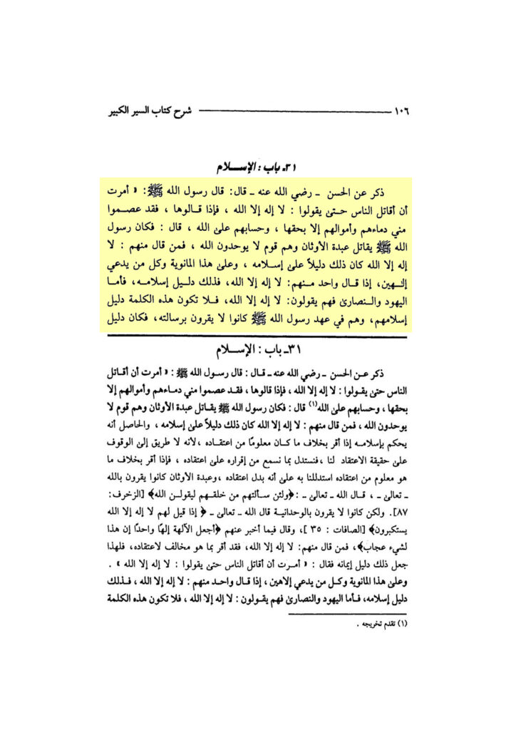 „Er erwähnte von al-Ḥasan, möge Allāh mit ihm zufrieden sein, er sagte: Der Gesandte Allāhs, Allāhs Segen und Frieden auf ihm, sagte: ‚Mir wurde befohlen, dass ich die Menschen bekämpfe, bis sie sagen: Lā ilāha illā Allāh. So wenn sie es gesagt haben, haben sie vor mir ihr Blut und ihr Vermögen beschützt, außer mit Recht (von ihnen). Und ihre Abrechnung ist bei Allāh‘. Er sagte: So bekämpfte der Gesandte Allāhs, Allāhs Segen und Frieden auf ihm, die Götzendiener und sie waren ein Volk, welches Allāh nicht für einzig erklärt hat. So wer von ihnen sagte: ‚Lā ilāha illā Allāh‘, jenes war jenes ein Beweis für seinen Islām. Und ebenso die Mānawiyya (sog. Manichäer) und jeder, der zwei Götter behauptet, wenn einer von ihnen ‚Lā ilāha illā Allāh‘ sagte, so ist jenes Beweis seines Islāms. So was die Juden und Christen betrifft, sie sagen: ‚Lā ilāha illā Allāh‘, so ist diese Äußerung kein Beweis für ihren Islām. Und in der Zeit des Gesandten Allāhs, Allāhs Segen und Frieden auf ihm, bestätigten sie nicht seine Botschaft. So war der Beweis des Islāms hinsichtlich ihnen die Bestätigung, dass Muḥammad der Gesandte Allāhs ist.