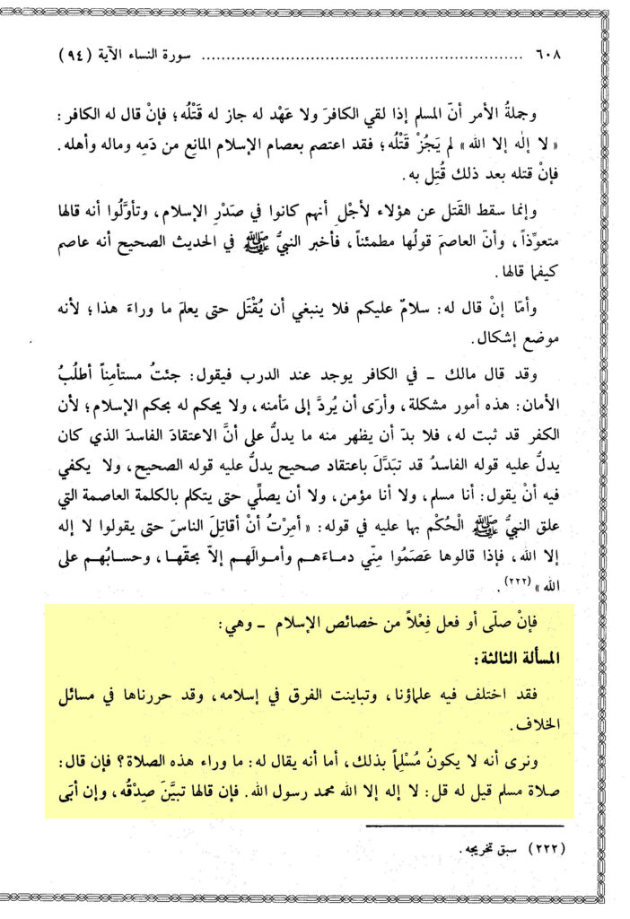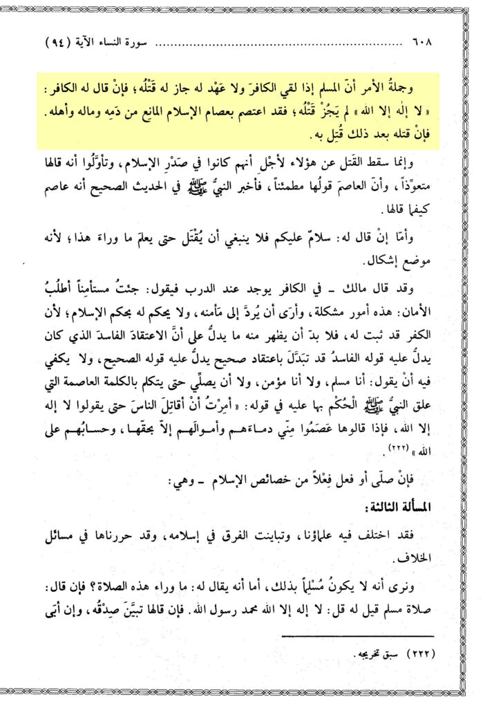 „Die Gesamtheit der Angelegenheit ist, dass wenn ein Muslim den Kāfir vorfindet, (…). So wenn der Kāfir zu ihm sagt: ‚Lā ilāha illā Allāh‘, (…)¹. So hat er seine Zuflucht gesucht durch den Riemen des Islāms, der von seinem Blut, seinem Vermögen und seinen Angehörigen verbietet. (…)¹“