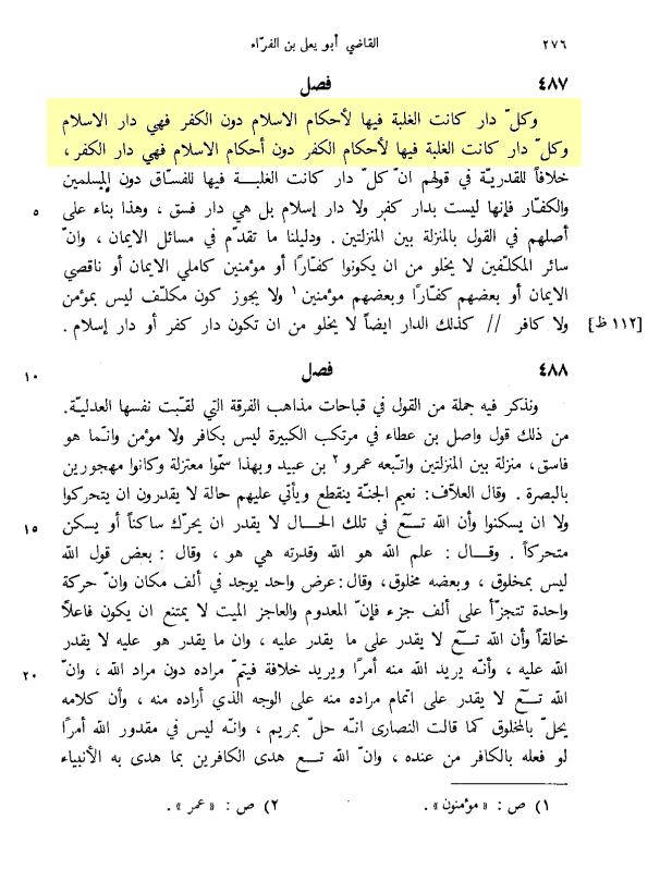 Imām Qāḍī Abū Ya’lā (gest. 458 هـ) sagt in al-Muʿtamad fī Uṣūl ad-Dīn über die Definition von Dār al-Islām, also dem Gebiet, dem Land, des Islāms und über die Definition von Dār al-Kufr: