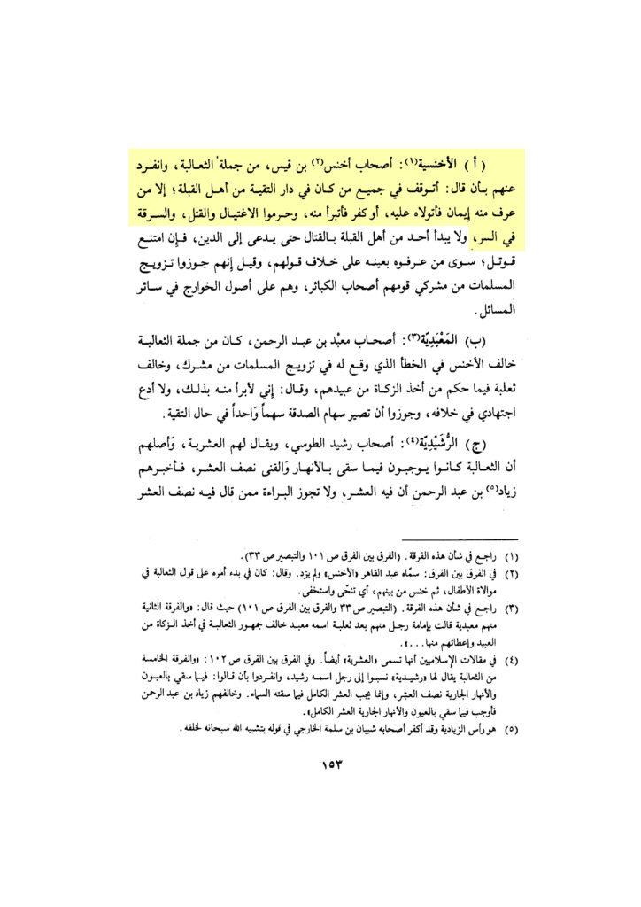 „Die Akhnasīya: Die Gefährten von Akhnas bin Qays von der Gesamtheit der Thaʿāliba. Und er (Akhnas) wandte sich ab von ihnen, indem er sagte: ‚Ich zögere bezüglich allen von Ahl al-Qibla, die in Dār at-Taqīya waren, außer von wem Glauben bekannt ist, so wende ich mich zu ihm, oder Kufr, so sage ich mich von ihm los‘. Und sie verbieten den Ightīyāl, das Töten und den Raub im Geheimen“